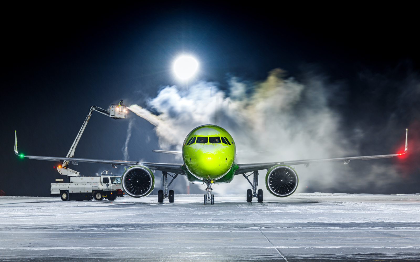 Воздушное судно подвергается обработке специальной антиобледенительной жидкостью перед вылетом, чтобы предотвратить образование льда на поверхности самолета во время полета. Дополнительно функционирует противообледенительная система самого ВС, обеспечивающая дополнительную защиту от обледенения в процессе эксплуатации.